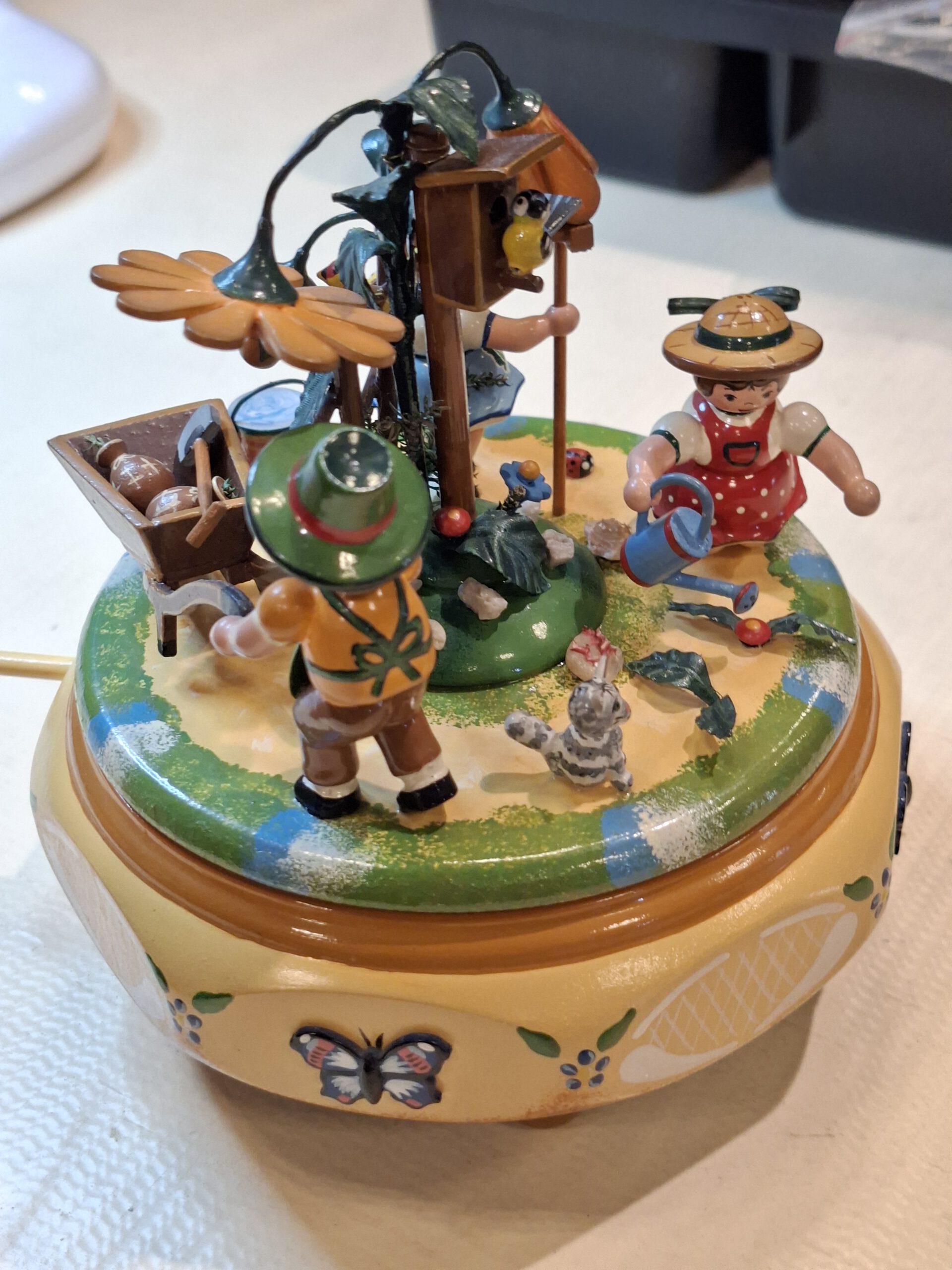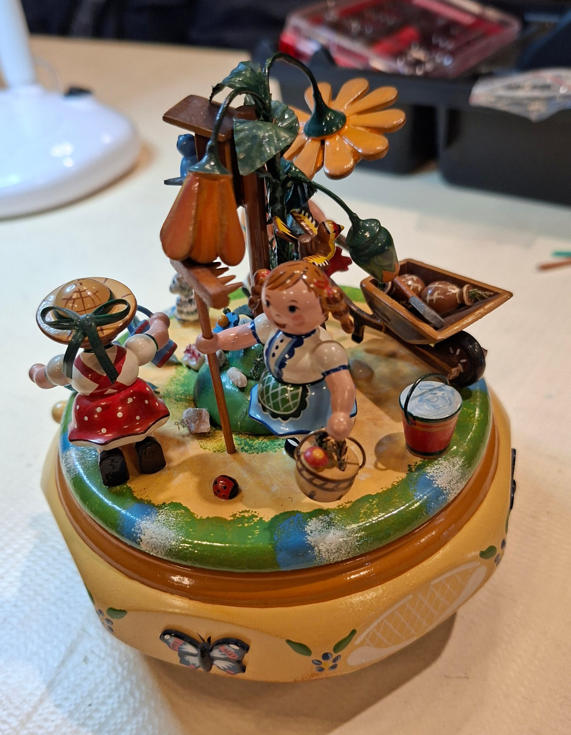 Kommt selten vor, ein Röhrenempfänger.Nach der Reparatur: der Vogel bewegt den Kopf und singt wieder.Der Plattenspieler tut wieder. Nach mehreren Umzügen war die Höheneinstellung für den Riemenantrieb verrutscht und müsste neu eingestellt werden.Ein Kleiderständer wird auf Gästewunsch in der Höhe angepasst.Ein Knopf hatte gefehlt. Nun ist der Regenschirm wieder einsetzbar. Auch kleine Reparaturen dienen der Weiterverwendung eines Gegenstands.